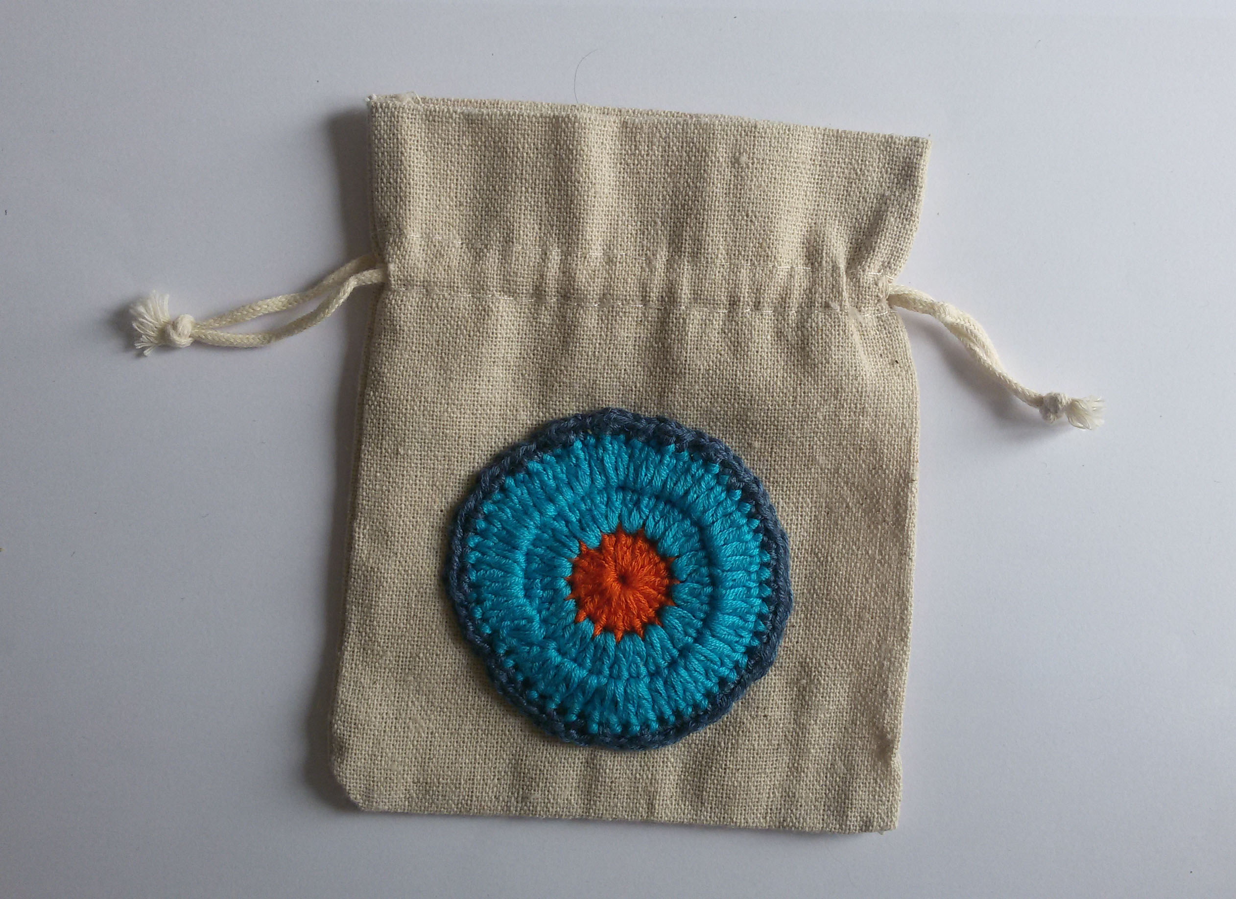 N.2 sacchetti di tela con decorazioni a uncinetto cerchio e fiore colorati.
