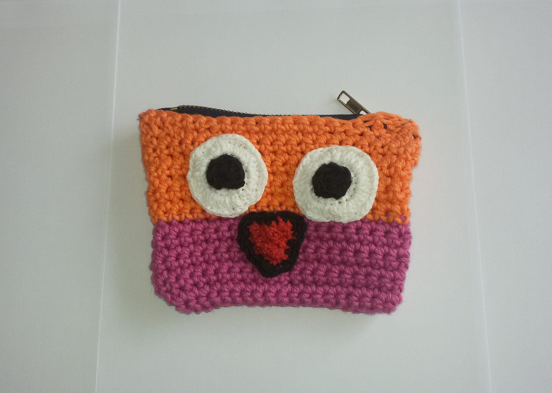 Pochette realizzata a mano a uncinetto a forma di gufo arancione e fuxia con chiusura a cerniera.