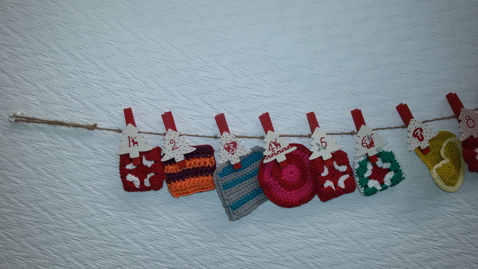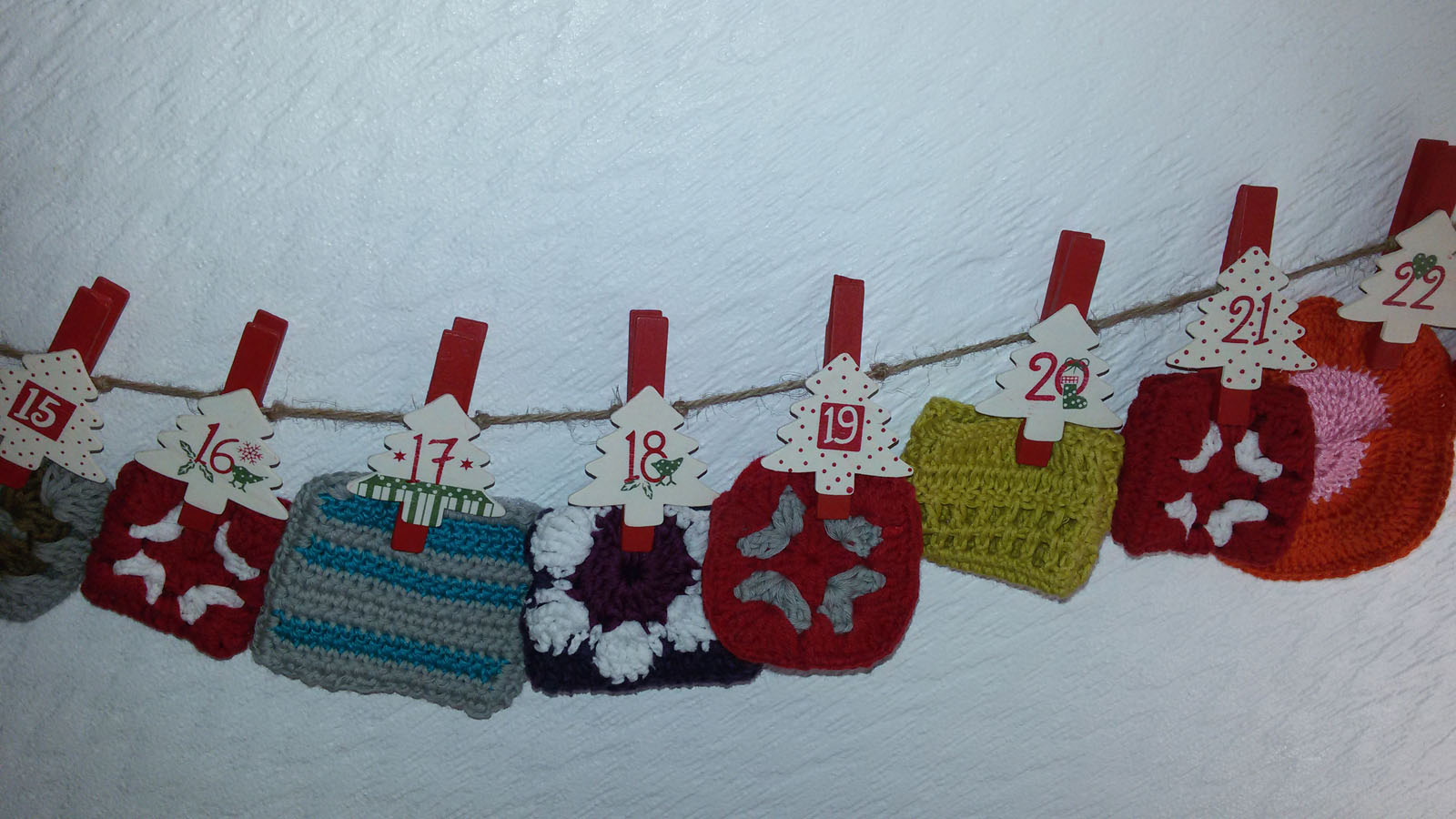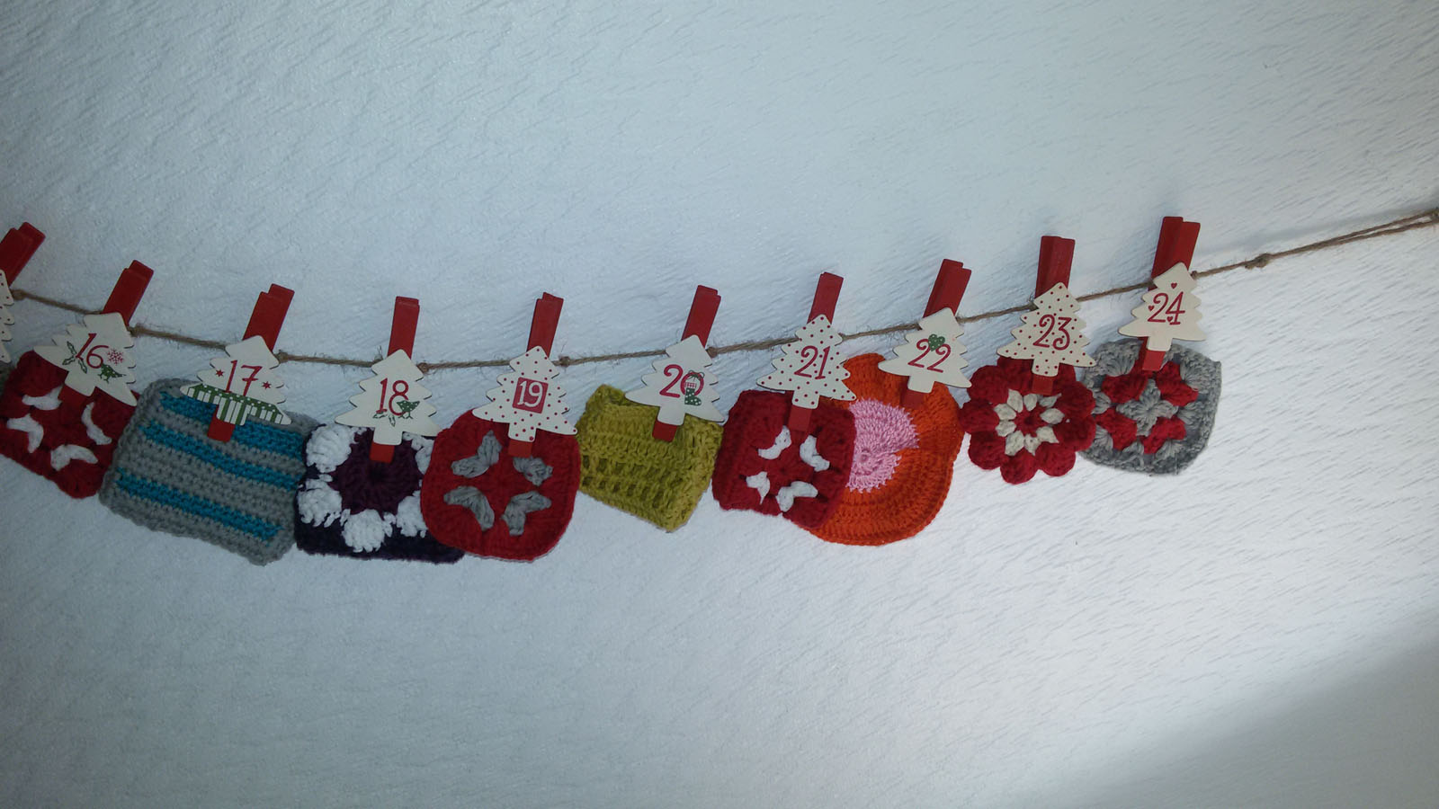 Calendario dell’avvento con sacchetti porta dolcetti fatti a uncinetto.